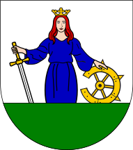 Auf Silber die rote Maid mit Schwert und zerbrochenem Rad über grünem Schildfuß.